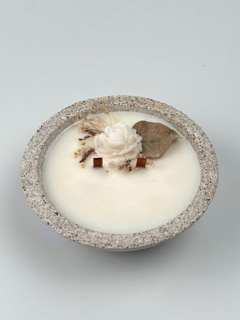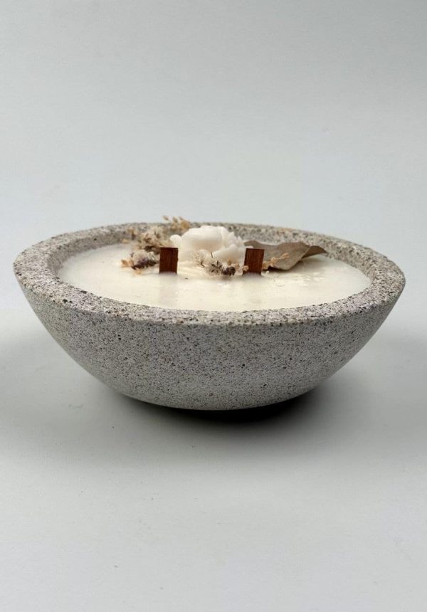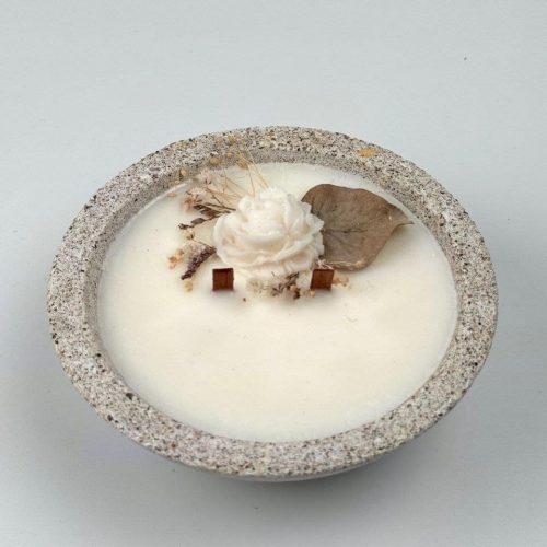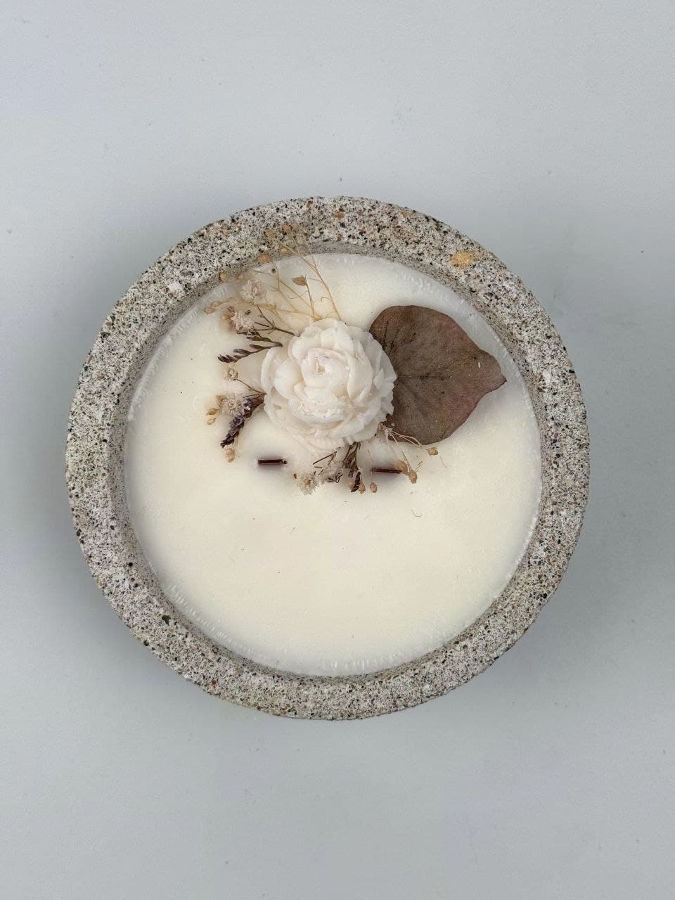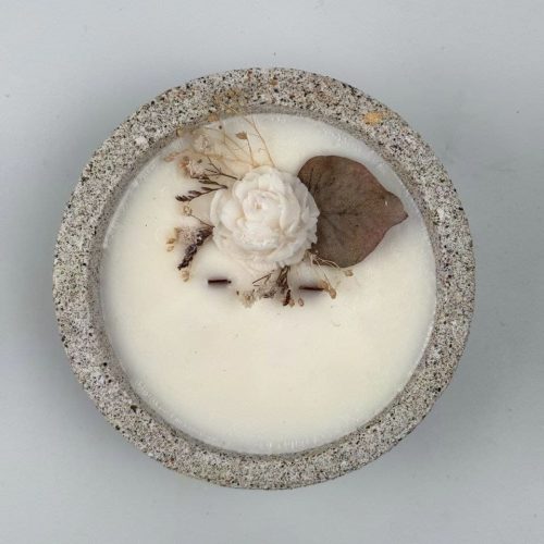 Notre bougies parfumée Flora en cire de soja, coulée dans un élégant contenant en béton et ornée de fleurs séchée,est une véritable œuvre d’art qui incarne l’harmonie entre la nature et l’art.